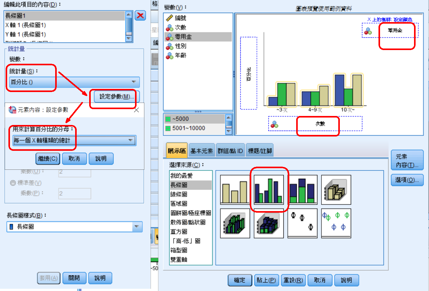 ◉【思源黑體字型NotoSansTC-Medium】下載連結(推薦下載這個,比較簡單) ※上傳【35-4-星巴克每個月消費次數與零用金關聯.sav】,到北科大軟體雲的windows電腦的F:\硬碟 ※(4).用北科大軟體雲的SPSS讀入【35-4-星巴克每個月消費次數與零用金關聯.sav】檔案 ➜此問卷共有200份受訪者填寫 ➜【次數】:每個月到星巴克消費次數,1為<=3次,2為4~9次,3為>=10次 ➜【零用金】:每個月可支配的零用金,1為<=5000,2為5001~10000次,3為>=10001次 ➜【性別】:1為男,2為女 ※(5).建立【交叉分析表:每個月到星巴克消費次數 vs 零用金】 ➜上方【分析】➜【描述統計】➜【交叉表分析,Cross tables】 ➜設定【列】➜【次數】 ➜設定【欄】➜【零用金】 ➜設定【資料格】➜【百分比】➜【欄位】 ![]() ※(6).【統計檢定】:判斷2個變數是否有關聯 ➜已知【類別 vs 類別】:用【卡方檢定(χ² test)】 ➜【疑問】:零用金是數值(10000),不是類別,為什麼可以用【卡方檢定?】 ➜請說出你的答案? ※(7).建立【交叉分析表:次數 vs 零用金】的【統計檢定】 ➜設定【統計資料】➜勾選【卡方檢定】 ![]() ➜【判別技巧】:若是我們計算出來的【漸近顯著性】值< 0.05,表示【2個變數之間呈現顯著性關聯】 ➜☎【結論】:計算結果的【漸近顯著性】值 = 0.013 < 0.05,表示【2個變數之間有顯著關聯】 ➜☎【表示】:受訪者到星巴克的【次數高低】,會因為【零用金】而有顯著差異 ※(8).如何目測看出【受訪者到星巴克的【次數高低】,會因為【零用金】而有顯著差異】 ➜目測:每個月到星巴克較少者(小於3次),主要是零用金較少者(<5000) ➜目測:每個月到星巴克稍多者(4~9次),主要是零用金較多者(>10000) ➜目測:每個月到星巴克最多者(大於10次),主要是零用金較多者(>10000) ➜結論:每個月到星巴克的次數,的確與零用金的高低而有顯著差異 ![]() ※(9).如何繪圖(困難點:Y軸要顯示百分比) ![]() ![]() 35-5.Final完整的word分析報告