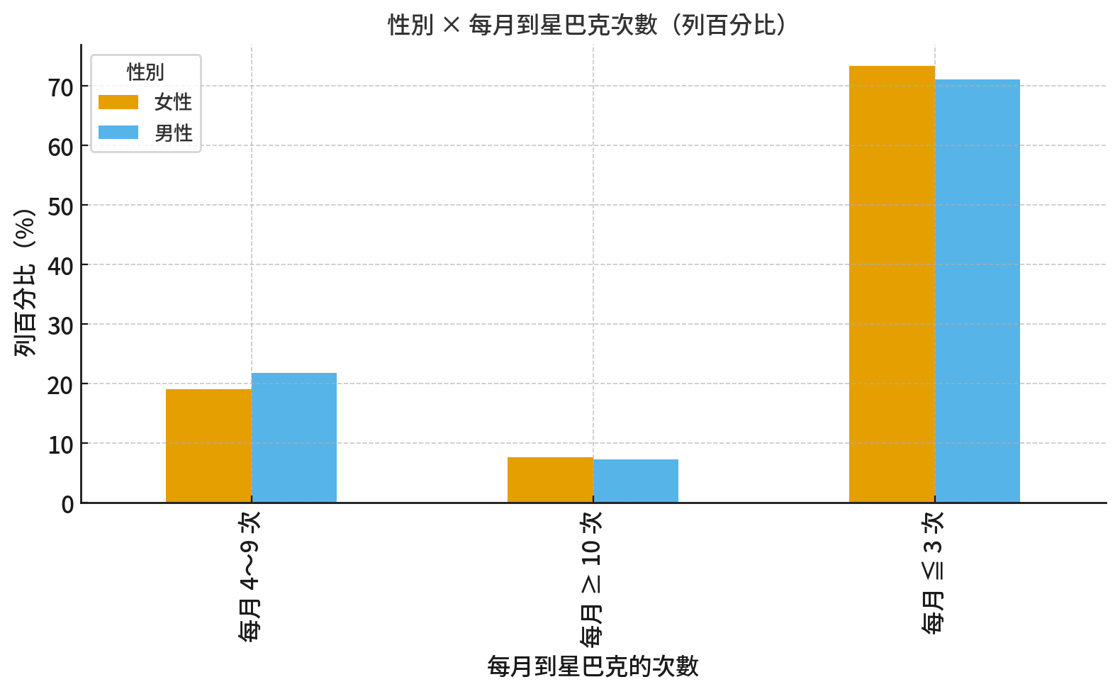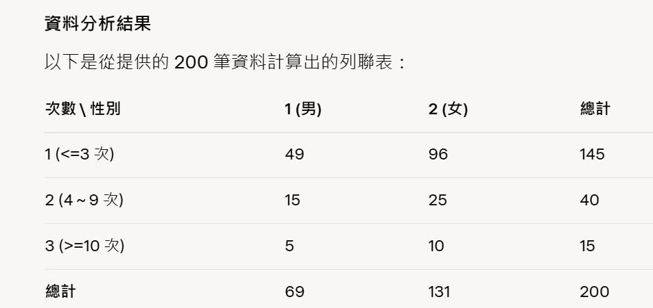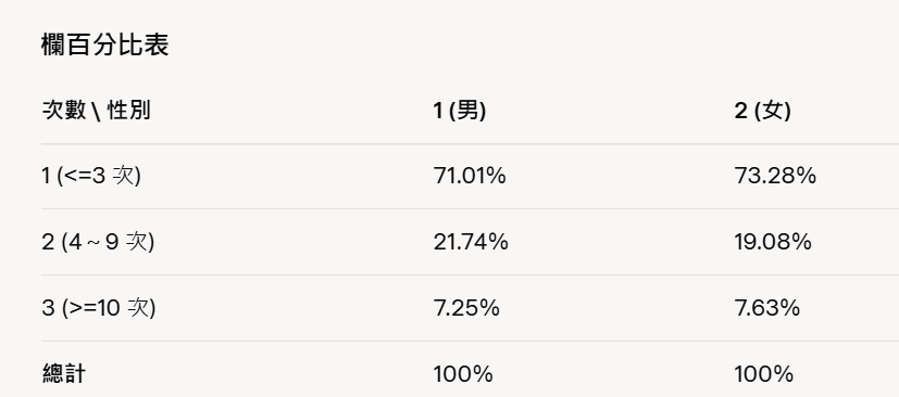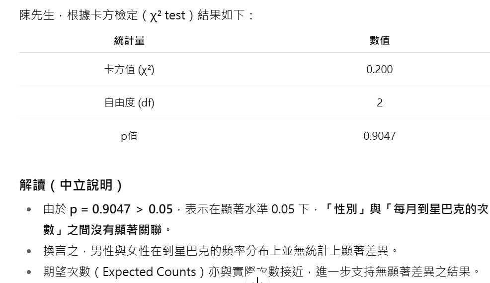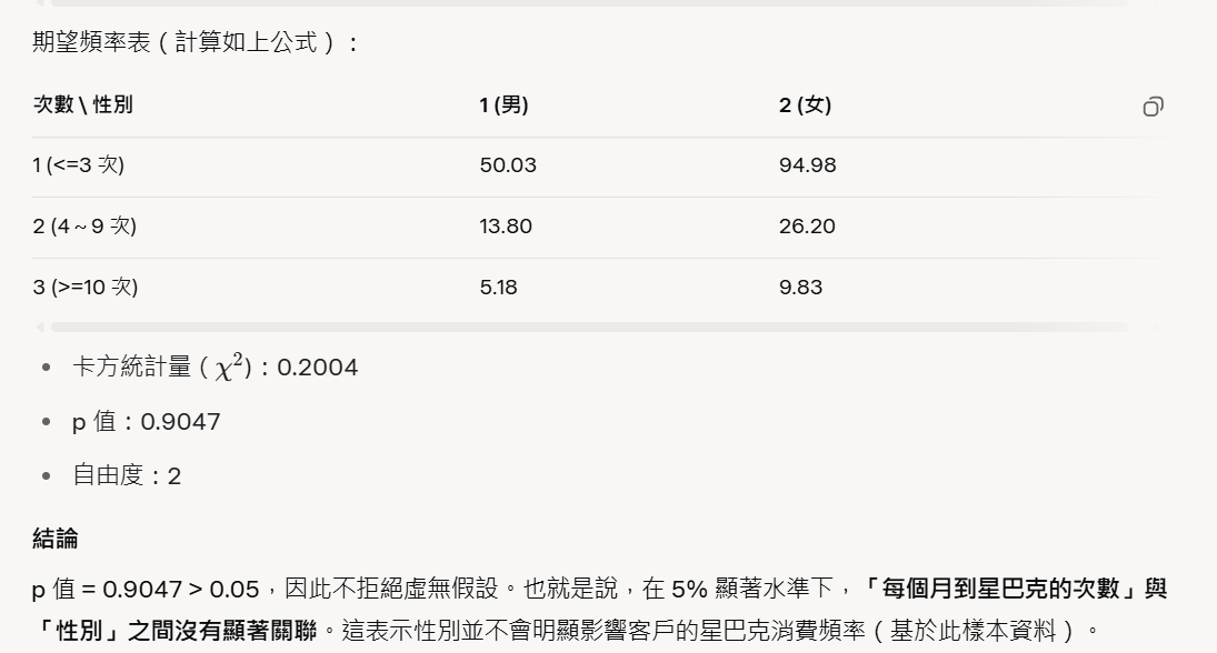 客戶【每個月到星巴克的次數】與【性別】是否存在顯著關聯?】(重要)